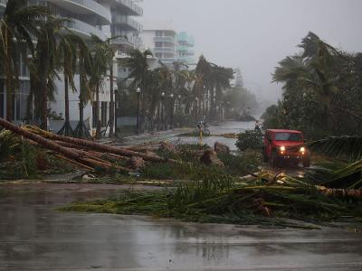 फ्लोरिडाच्या मियामी बीचजवळ उन्मळून पडलेल्या वृक्षांमधून वाट काढताना एक कार आणि दोन सायकलस्वार.