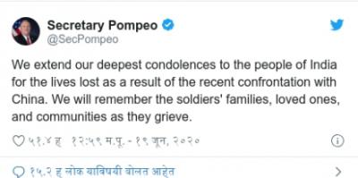 माइक पोम्पिओ म्हणाले की, चीनसोबत झालेल्या संघर्षात भारतीय सैनिकांचा मृत्यू झाला. भारतीयांप्रती आम्ही सहानुभूती व्यक्त करत आहोत. या सैनिकांचे कुटुंबीय, नातेवाईक आणि त्यांच्या समाज यांची या दु:खद प्रसंगी आम्हाला आठवण येईल, असं माइक पोम्पिओ यांनी सांगितले.