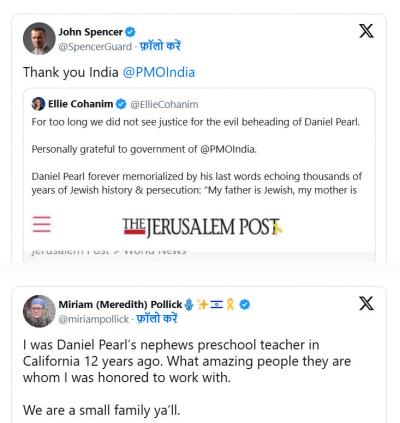 तर अमेरिकन कार्यकर्ता एमी मेक यांनीही असगरच्या मृत्यूवर आनंद व्यक्त केला. भारताने पर्लच्या हत्येचा बदला घेतला आहे. ऑपरेशन सिंदूरमधून दहशतवादी गड उद्ध्वस्त केले. पाश्चिमात्य देशांनी इस्लामिक दहशतवादाशी कसे लढले पाहिजे हे भारताकडून शिकायला हवे असं त्यांनी म्हटलं.