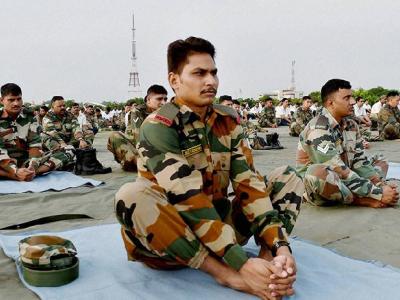 लष्कराचे जवान योगासन करताना.