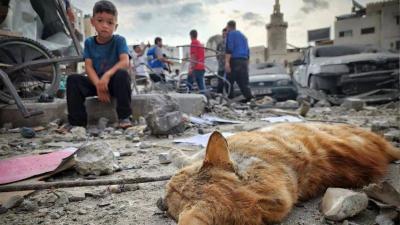 गाझापट्टीवर करण्यात आलेल्या बॉम्बफेकीमध्ये एक इमारत कोसळली आहे. तिथे हल्ल्यात मृत्युमुखी पडलेल्या एका कुत्र्याच्या मृतदेहाकडे खिन्नपणे पाहत बसलेला एक मुलगा.