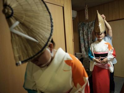 जपानमध्ये कला सादर करण्याच्या प्रतीक्षेत असलेल्या मुली. मियोशी शहरामध्ये इकेदा आवा ओदोरी हा सण पारंपरिक रीतीने साजरा झाला.