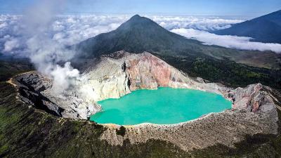 इथे एक क्रेटर आहे जे 1 किलोमीटर व्यासाचं आहे. इथे निळ्या रंगाचं पाणी आहे. जे पूर्णपणे अॅसिडीक आहे. म्हणजे तेजाबचा तलाव. लोक इथून सल्फरचं खनन करून नेतात. इथे सल्फर करणाऱ्या मजुरांना एका दिवसाचे 13 डॉलर म्हणजे 1013 रूपये मिळतात. (फोटोः ट्विटर/oneironaut)
