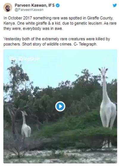 उत्तर-पूर्व केनियाच्या ग्रासिया काउंटी येथे शिकाऱ्यांनी अतिशय दुर्मीळ अशा पांढऱ्या जिराफ मादी आणि तिच्या पिल्लाची शिकार केली आहे.
