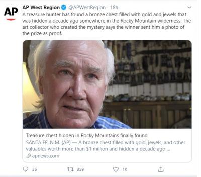 अमेरिकेतील खडकाळ पर्वतांमध्ये हजारो लोकांनी हा खजिना शोधण्याच प्रयत्न केला. मात्र त्यांना यश आले नाही. मात्र हा खजिना ज्या व्यक्तीने शोधला त्याला पूर्ण कविता पाठ होती. त्याला प्रत्येक शब्द आणि संकेत कळत होते.