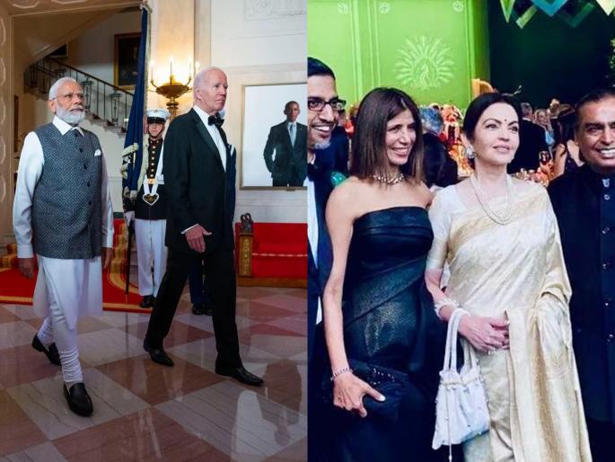 1 / 10पंतप्रधान नरेंद्र मोदींचा अमेरिका दौरा सध्या जगभरात चर्चेचा विषय बनला आहे. व्हाईट हाऊसमध्ये नरेंद्र मोदींचं राष्ट्राध्यक्ष जो बायडन यांनी जोरदार स्वागत केलं. त्यानंतर दोन्ही नेत्यांनी एकत्र पत्रकार परिषदही घेतली. 2 / 10पत्रकार परिषदेपूर्वी अमेरिका आणि भारत यांच्यात अनेक महत्त्वाच्या करारावर स्वाक्षऱ्या झाल्या. त्यामध्ये, संरक्षणविषयक करार महत्त्वाचे मानले जातात. 3 / 10अमेरिकेचे राष्ट्राध्यक्ष जो बायडन आणि फर्स्ट लेडी जिल बायडन यांनी स्टेट डिनरसाठी पंतप्रधान नरेंद्र मोदींनी निमंत्रित केलं होतं. त्यानुसार, व्हाईट हाऊसमध्ये स्टेट डिनर पार्टीही झाली. 4 / 10पंतप्रधान नरेंद्र मोदींसह या स्टेट डिनरसाठी देशातील दिग्गजांनी हजेरी लावली असून उद्योगपती मुकेश अंबानी हे आपल्या पत्नी निता अंबानी यांच्यासह या डिनर पार्टीसाठी व्हाईट हाऊसमध्ये पोहोचले आहेत. 5 / 10व्हाईट हाऊसच्या साऊथ लॉनमध्ये स्टेट डिनरसाठी जवळपास ४०० पाहुण्यांना निमंत्रण देण्यात आलं आहे. या लॉनला भारतीय थीमने सजवण्यात आले होते. 6 / 10अंबानी यांच्यासह व्हाईट हाऊसमधील या स्टेट डिनर पार्टीसाठी पेप्सिको कंपनीची सीईओ इंदिरा नुई यांचाही समावेश आहे. 7 / 10महिंद्रा अँड महिंद्रा कंपनीचे चेअरमन आनंद महिंद्रा हेही अमेरिकेत या स्टेट डिनर पार्टीला उपस्थित होते. 8 / 10दिग्गज स्टॉक ब्रोकिंग कंपनी Zerodha चे संस्थापक निखील कामथ हेही निमंत्रण पाहुण्याच्या यादीत होते. त्यांनीही पार्टीला हजेरी लावली होती. 9 / 10जगप्रसिद्ध कंपनी गुगलचे सीईओ सुंदर पिचई हेही पत्नी अंजलीसह व्हाईट हाऊसमधील मोदींसमवेतच्या पार्टीला उपस्थित होते. 10 / 10एडोबचे सीईओ शंतणु नारायण, मायक्रोसॉफ्टचे सीईओ सत्या नंडेला हेही कार्पोरेट विश्वातील दिग्गज म्हणून या डिनर पार्टीत सहभागी झाले होते.