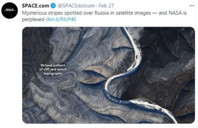 रशियात अजब भूवैज्ञानिक रेषांमुळे नासाचे वैज्ञानिक हैराण झाले आहेत. सायबेरिया भागात मर्खा नदीच्या आजूबाजूला आकाशातून घेतलेल्या सॅटेलाइट फोटोंमध्ये या अनोख्या रेषा दिसत आहेत. या रेषा बघून वैज्ञानिक प्रश्नात पडले आहेत. या रेषांमागील कारण त्यांना समजलेलं नाही.