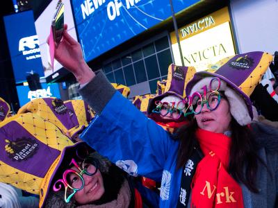 टाईम्स स्क्वेअरवर नववर्षाच्या स्वागताचा क्षण कॅमे-यात कैद करताना तरुणी