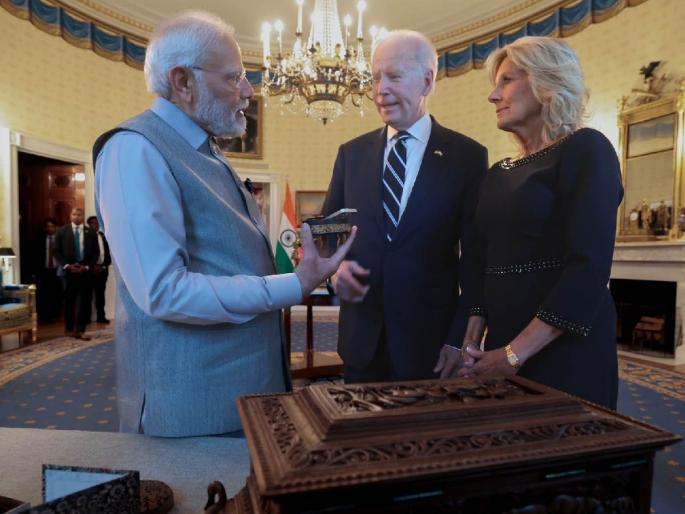 1 / 12पंतप्रधान नरेंद्र मोदी तीन दिवसांच्या अमेरिका दौऱ्यावर गेले आहेत, पीएम मोदींनी अमेरिकेतील उद्योगपतींची भेट घेतली. आज मोदींनी अमेरिकेचे राष्ट्राध्यक्ष ज्यो बायडेन यांची भेट घेतली. यावेळी मोदींनी त्यांना १० प्रकारच्या भेटवस्तू दिल्या. या भेटवस्तू अनेक प्रकारे खास आहेत. 2 / 12या विशेष भेटवस्तू भारतीय परंपरा दर्शवतात.या भेट वस्तु प्रसंगी दिल्या जातात. यजुर्वेदात त्यांचा उल्लेख आहे. १० विशेष प्रकारच्या भेटवस्तू सहस्त्र पूर्ण चंद्रोदयम उत्सवाचा भाग मानल्या जातात. 3 / 12राष्ट्राध्यक्ष ज्यो बायडेन यांनी आयुष्याची ८० वर्षे पूर्ण केली आहेत. भेटवस्तूंचा संबंध त्यांच्या वयाशी आहे. यजुर्वेदात असे म्हटले आहे की, जेव्हा एखादी व्यक्ती ८० वर्षे आणि ८ महिने पूर्ण करते तेव्हा त्या वक्तीला 'दृष्टि सहस्रचंद्र' म्हणतात, म्हणजे ज्याने १००० पौर्णिमा पाहिल्या आहेत.4 / 12सहस्र पूर्ण चंद्रोदयम उत्सवादरम्यान, भारतामध्ये दास दानम म्हणजेच १० विविध प्रकारच्या वस्तू दान करण्याची प्रथा आहे. त्यात अनेक गोष्टींचा समावेश होतो- हिरण्यदान (सोने), अग्निदान (तूप), रौप्यदान (चांदी), लवंदन (मीठ), गौदान (गाय), धान्यदान (धान्य), वस्त्रदान (कपडे), गुडदान (गूळ), भूदान (जमीन), टिल्डन (तीळ).5 / 12यावेळी पंतप्रधान नरेंद्र मोदी यांनी अमेरिकेचे राष्ट्राध्यक्ष बायडेन यांना भारतीय परंपरेचे दर्शन घडवणाऱ्या अनेक विशेष भेटवस्तू दिल्या.6 / 12पीएम मोदींनी ज्यो बायडेन यांना खास प्रकारची चंदनाची पेटी भेट दिली आहे. जयपूर, राजस्थान येथील एका कुशल कारागिराने ती पेटी तयार केली आहे. त्यात वापरलेले चंदन कर्नाटकातील म्हैसूर येथून आणले होते. या पेटीवर वनस्पती आणि प्राण्यांचे आकार कोरलेले आहेत.7 / 12राजस्थानमध्ये चंदनावर नक्षीकाम करण्याची कला खूप प्रसिद्ध आहे. हे अनेक पिढ्यांपासून चालत आले आहे. या कलेचा नमुना बायडेन यांना भेट म्हणून देण्यात आला आहे. विशेष हाताने बनवलेल्या चांदीच्या पेटीत प्रतीकात्मक दास दानम किंवा दहा दान असतात. या खास प्रसंगी दिल्या जाणाऱ्या भेटवस्तूचे प्रतीक आहे.8 / 12बायडेन यांना दिलेल्या चंदनाच्या पेटीत श्री गणेशाची मूर्ती आहे. श्री गणेशाला अडथळ्यांचा नाश करणारे म्हटले जाते आणि ते सर्व देवतांमध्ये पहिले आहेत. पेटीत ठेवलेल्या गणेशाची चंदनाची मूर्ती कोलकात्याच्या कलाकारांनी तयार केली आहे.9 / 12भारतीय परंपरेनुसार, घरांमध्ये दिवे ठेवण्याची प्रथा आहे. ती जिथे ठेवली जाते ती जागा पवित्र मानली जाते. यामध्ये कापसाची वात पेटवून देवाला प्रार्थना केली जाते. पंतप्रधान मोदींनी बायडेन यांना चांदीचा दिवा भेट दिला. कोलकात्याच्या पाचव्या पिढीतील कारागिरांनी ते तयार केले आहे.10 / 12ज्यो बायडेन यांना दिलेल्या भेटवस्त