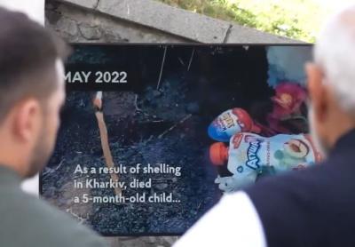 टीव्हीवर दाखवण्यात येत असलेल्या दृश्यांमध्ये मे २०२२ असं लिहिलेलं होतं. त्या दिवशी खारकिव्हमध्ये झालेल्या बॉम्बवर्षावामध्ये एका मुलाचाही मृत्यू झाला होता. हे फोटो पाहून दोन्ही नेते भावूक झाले.
