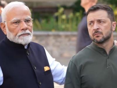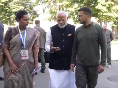 तेव्हा नरेंद्र मोदी हे झेलेन्स्की यांच्या खांद्यावर हात ठेवून काहीतरी सांगताना दिसत होते.
