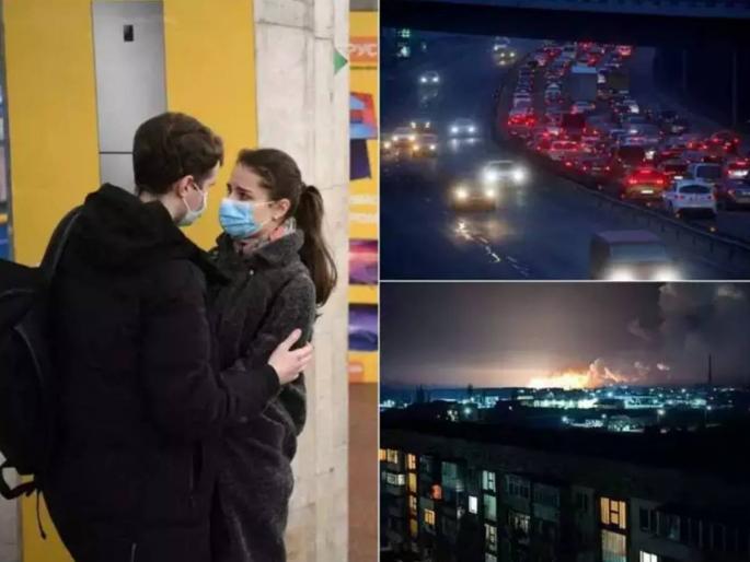 1 / 11रशियानं युक्रेन विरोधात युद्धाची घोषणा केल्यानंतर युक्रेनमधील नागरिकांचं टेन्शन वाढलं आहे. युक्रेनमधील नागरिक सध्या कोणत्या परिस्थितीतून जात असतील याची कल्पना देखील आपण करु शकत नाही. डोक्यावरुन घिरट्या घालणारी लढाऊ विमानांच्या भीतीच्या सावटाखाली नागरिक जीव मूठीत घेऊन घराघरात दडून बसले आहेत. 2 / 11युक्रेनमध्ये सध्या धुमाकूळ उडाला असून काही ठिकाणी बॉम्बहल्ले झाल्याचेहीची छायाचित्र समोर आली आहेत. 3 / 11युक्रेनच्या कीव, डोनबास, ओडेसासह अनेक शहरांमध्ये बॉम्बस्फोटाचे आवाज ऐकू आले आहेत.4 / 11युक्रेननमध्ये सायरन वाजवून नागरिकांना सतर्कतेची सूचना देण्यात येत आहे. हा फोटो युक्रेनची राजधानी कीव येथील मेट्रो स्थानक परिसरातील आहे. आपल्या जवळच्या व्यक्तींना आपण आता पुन्हा पाहू शकणार आहोत की नाही याची कल्पना नागरिकांना नाहीय. अनेकांच्या डोळ्यांत अश्रू आणि काळजात भीतीचं वातावरण संपूर्ण युक्रेनमध्ये आहे. (फोटो- एएफपी)5 / 11युक्रेनची राजधानी कीवमध्ये एअर स्ट्राइकसाठीचे सायरन वाजवून अलर्ट केलं जात आहे. कीव शहरात सकाळपासूनच बॉम्बस्फोटांचे आवाज नागरिकांना ऐकू येत आहेत. 6 / 11रशियाकडून युक्रेनची राजधानी कीव शहराला लक्ष्य केलं जात असल्यामुळे अनेक जण शहर सोडून जाण्याचाही निर्णय घेताना दिसत आहेत.7 / 11बँका बंद असल्यानं अनेक ठिकाणी एटीएमबाहेर नागरिक गर्दी करू लागले आहेत. 8 / 11युक्रेनचे नागरिक ठिकठिकाणी आणि आपल्या घरोघरी युद्ध लवकर संपावं, शांतता नांदावी यासाठी प्रार्थना करत आहेत.9 / 11रशियाच्या युद्धाच्या निर्णयामुळे युक्रेनमध्ये येणाऱ्या प्रवासी विमानांना धोका निर्माण होऊ शकतो याच पार्श्वभूमीवर युक्रेननं देशाच्या हवाई मार्गांवर बंदी घातली आहे. 10 / 11युक्रेनची राजाधानी कीव शहराला रशियाकडून लक्ष्य केलं जात असल्यानं शहराबाहेर जाणाऱ्यांची गर्दी, ठिकठिकाणी ट्राफिक जाम11 / 11रशियानं केलेल्या हल्ल्यात अनेक घरं, वाहनांचं नुकसान झाल्याचं दृश्यांमधून दिसून येत आहे.