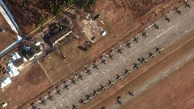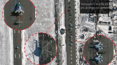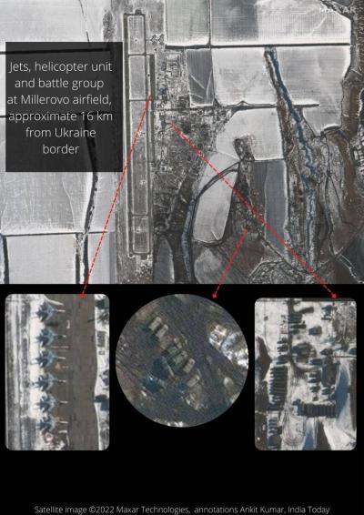 इमेजमध्ये संबंधित ठिकाणी आधीपासूनच सैनिक आणि युद्ध शस्त्रास्त्र तैनात असल्याचं दिसून आलं आहे. युक्रेनच्या सीमेपासून जवळपास १६ किमी दूरवर मिलरोवो हवाई क्षेत्रात टँक, सैनिक वाहक आणि इतर युद्ध साहित्य घेऊन सज्ज असलेली हेलिकॉप्टर्सची तुकडी दिसून आली आहे.