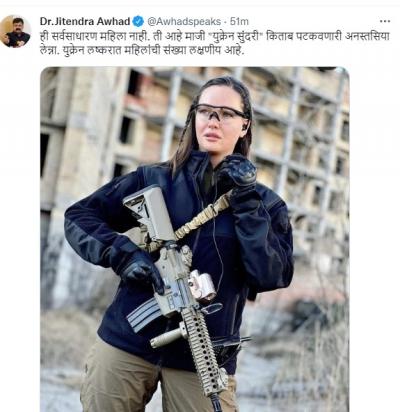 राज्याचे कॅबिनेटमंत्री आणि राष्ट्रवादीचे नेते जितेंद्र आव्हाड यांनीही ट्विटर अकाऊंटवरुन माजी युक्रेन सुंदरीचा फोटो शेअर केला आहे. युक्रेन लष्करात महिलांची संख्या लक्षणीय आहे, असेही त्यांनी म्हटलंय.