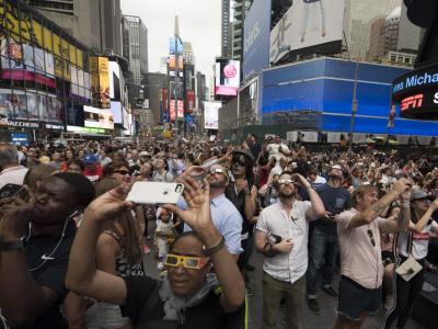 न्यूयॉर्कमधील टाईम्स स्केअर चौकात सूर्यग्रहण पाहण्यासाठी नागरिकांनी गर्दी केली होती.