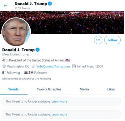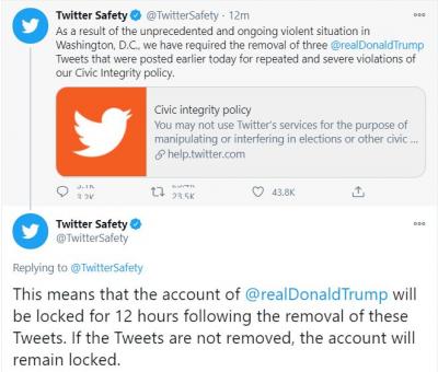 दरम्यान, नियमांचं उल्लंघन केल्याप्रकरणी ट्विटरने डोनाल्ड ट्रम्प यांचे अकाउंट १२ तासांसाठी, तर फेसबुकने २४ तासांसाठी लॉक केले आहे. तसेच, नागरी अखंडत्वाबद्दल नियम मोडणारे तीन ट्विट्स डिलीट न केल्यास डोनाल्ड ट्रम्प यांच्यावर कायमस्वरुपी बंदी आणण्याचा इशारा सुद्धा ट्विटरने दिला.