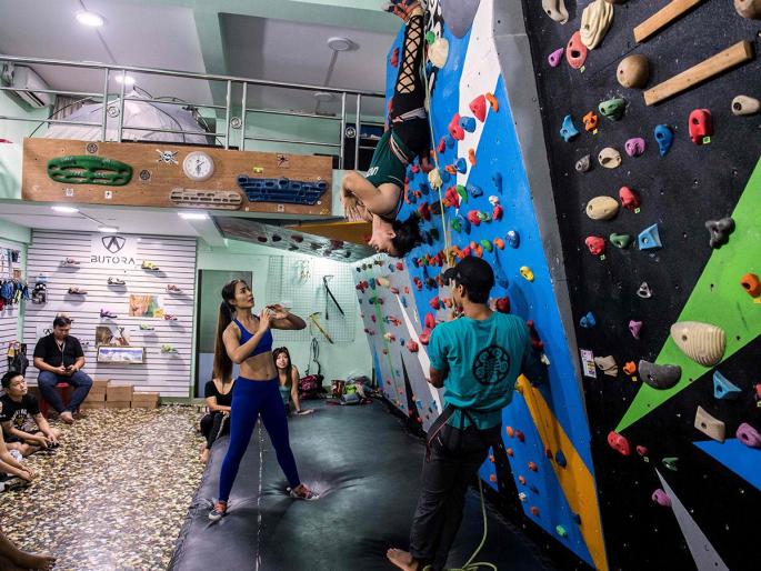 म्यानमारच्या यानगॉनमध्ये क्लायम्बिंग वॉलवर योग प्रात्यक्षिके
