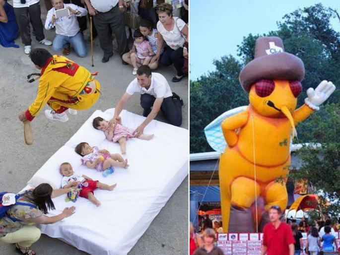 1 / 5बेबी जंपिंग फेस्टिव्हल- लहान मुलांच्या वरून उड्या मारण्याचा हा अजब उत्सव आहे. स्पेनमध्ये हा उत्सव साजरा केला जातो. या उत्सवात लांबसडक व्यक्ती लहानग्यांच्या अंगावरून उड्या मारण्याचा प्रयत्न करतो. 2 / 5व्हेजिटेरियन फेस्टिव्हल- हा उत्सव थायलंडमध्ये साजरा केला जातो. उत्सवाचे फोटो पाहून हा किती भयानक असेल याची खात्री पटते. हे फेस्टिव्हलही नावाच्या विपरीत आहे. 3 / 5मच्छरांचं फेस्टिव्हल- टेक्सासमधल्या क्लूटमध्ये हा चित्रविचित्र उत्सव साजरा केला जातो. तीन दिवशीय या फेस्टिव्हलमध्ये चित्रविचित्र खेळ खेळले जातात. 4 / 5कोनकी सूमो फेस्टिव्हल- जपानच्या यामाजी मंदिरात या उत्सव साजरा केला जातो. कोनकी म्हणझे रडणं. सूमो लाकूड हातात घेऊन दोन लहान मुलं एकमेकांसमोर उभी राहतात. त्यानंतर एकमेकांना मारण्यास सुरुवात करतात. जो पहिल्यांदा जोरजोरात लढेल तो जिंकल्याचं घोषित केलं जातं. 5 / 5 बोलस दे फुएगो- हा उत्सव साल्वाडोरमध्ये साजरा केला जातो. नेजलातल्या एका छोट्या शहरातील लोक एकत्र येतात आणि एकमेकांवर आगीचे गोळे फेकतात. दोन गट एकमेकांवर गोळा फेक करत असून, त्यामुळे लोकांचं मनोरंजन होतं.