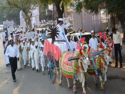 अहिंसा सद्भावना शांती यात्रेत सजविलेल्या बैलगाडीवर चरखा ठेवण्यात आला होता. शांती यात्रेत विद्याथ्र्यानी सहभाग घेतला.