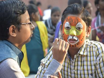 वसुंधरा महोत्सवातंर्गत गांधी उद्यानात आयोजित फेस पेंटिंग स्पर्धेत विद्यार्थ्याच्या चेहºयावर वाघाचे चित्र काढताना विद्यार्थी.