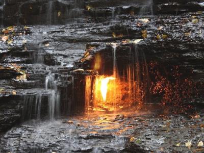 या फोटोमध्ये वरून पाणी पडत असल्याचं दिसतंय. तसेच पाणी कोसळत असलेल्या खडकांमध्येच आग आहे. हासुद्धा निसर्गाचा एक चमत्कार असून, मिथेन गॅसमुळे या आगीच्या ज्वाळा दिसत आहेत.