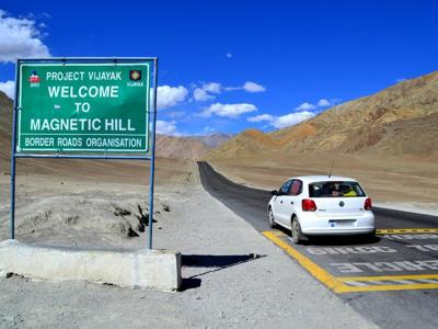 5) मॅग्नेटिक हिल, लदाख - लदाख आपल्या उंचच उंच डोंगरांसाठी प्रसिद्ध आहे. त्यासोबतच आणखी येथे अशीही जागा आहे जिथे गाडी चालवताना गाडी स्वत:हूनच वरच्या दिशेने धावू लागते.
