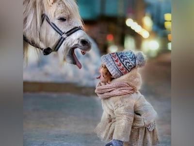 ही चिमुरडी घोड्याला चिडवून दाखवतेय.