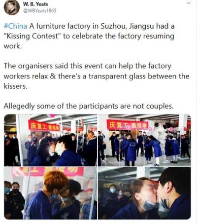 Coronavirus : बोंबला! लॉकडाऊनमधे सूट मिळाली तर चीनच्या कंपनीत 'किसिंग कॉन्टेस्ट'चं आयोजन, फोटो व्हायरल...