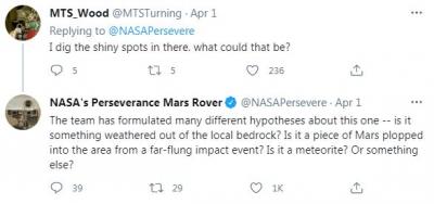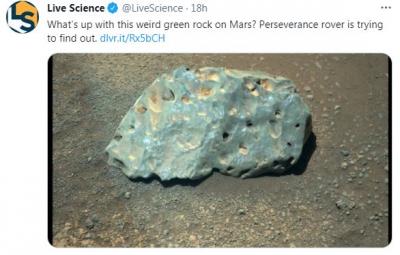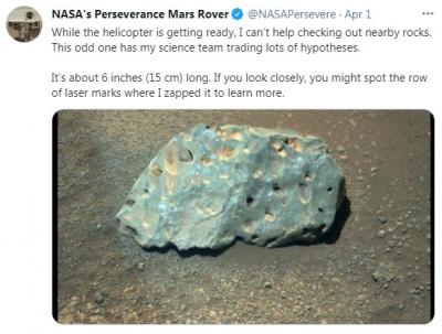 नासाच्या पर्सिवरें रोवरने आपल्या ट्विटर हॅंडलवर लिहिले आहे की, इंजीन्यूटी हेलिकॉप्टर मंगळ ग्रहावर उतरवल्यानंतर आमच्या टीमला हा दगड आढळून आला. याचे फोटो वेगवेगळ्या कॅमेराने घेण्यात आले. सध्या आमच्याकडे याबाबत केवळ अंदाज आहेत. जोपर्यंत रोवर टेस्ट करत नाही तोपर्यंत स्पष्ट होणार नाही.