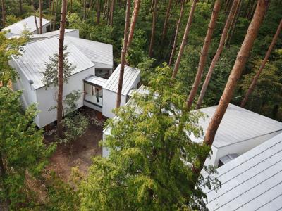 चेरी आणि पाईन झाडांमध्ये बॉक्स टाकून घराची उभारणी करण्यात आली आहे.