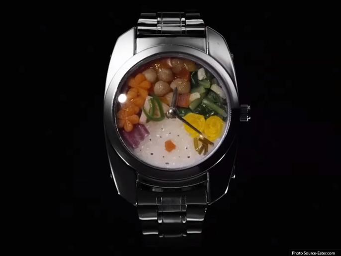 1 / 6धकाधकीच्या दैनंदिन जीवनामुळे अनेकदा वेळेवर जेवता येत नाही. त्यामुळे जेवणाची आठवण करुन देणारं घड्याळ जपानमध्ये तयार करण्यात आलं.2 / 6बेन्टो वॉचमध्ये अन्नपदार्थांचा वापर करण्यात आला आहे. विशेष म्हणजे हे पदार्थ खरेखुरे आहेत. 3 / 6या भन्नाट घड्याळाची डायल उघडा येऊ शकते. त्यातील पदार्थदेखील खाता येतात.4 / 6घड्याळ घालणाऱ्या व्यक्तीला जेवणाची आठवण व्हावी यासाठी या घड्याळाची निर्मिती करण्यात आली आहे.5 / 6घड्याळात जपानी लोक दररोज खात असलेल्या पदार्थांचा समावेश आहे. विशेष म्हणजे हे पदार्थ खाण्यासाठी घड्याळासोबत काटेदेखील देण्यात आले आहेत.6 / 6हे भन्नाट घड्याळ अद्याप बाजारात आलेलं नाही. केवळ संकल्पना म्हणून या घड्याळाची निर्मिती करण्यात आली आहे. मात्र लवकरच या घड्याळाचं व्यावसायिक उत्पादन केलं जाऊ शकतं.