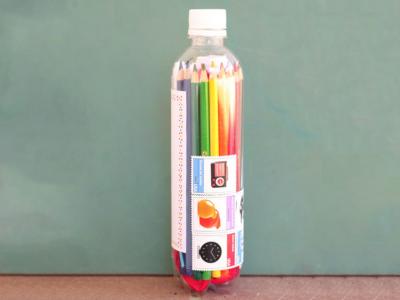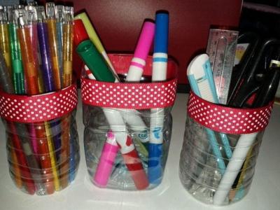 पेन ठेवण्यासाठी प्लास्टीकचा स्टॅण्ड तयार करण्यात आला आहे. प्लास्टीकच्या बाटलीला मधोमध कापून हे तयार करण्यात आलं आहे. लाल रंगाची रिबीन लावून याचे सौंदर्य वाढवण्यात आले आहे.
