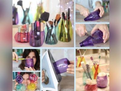 वेगवेगळ्या रंगाच्या प्लास्टीकच्या बॉटलसचा वापर करून आकर्षक मेकअपचे ब्रश तसंच टुथूब्रश ठेवण्यासाठी स्टॅण्ड तयार करण्यात आला आहे.