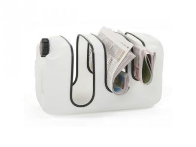 पांढरा रंग असलेल्या प्लास्टीकच्या कॅनचा वापर करून त्याचा वापर मॅग्झीन्स ठेवण्यासाठी करण्यात आला आहे.
