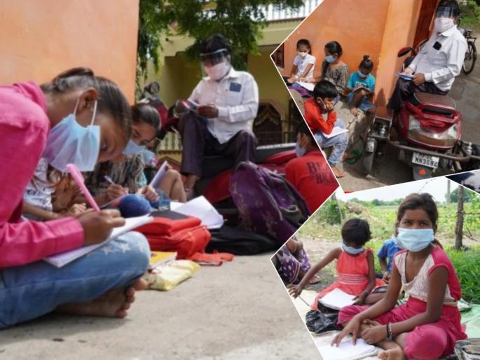 1 / 8कोरोना काळात जसा मुलांच्या शिक्षणावर परिणाम झाला. त्याचप्रमाणे शिक्षकांनाही अनेक प्रसंगांना तोंड द्यावे लागले. पण काही शिक्षक असे आहेत. त्यांनी आपल्या कामावर लॉकडाऊनचा प्रभाव न पडू देता आपलं काम सुरू ठेवलं आहे. मध्यप्रदेशातील इंदूरमध्ये एका सरकारी शाळेतील शिक्षकांच्या कामामुळे सर्वचजण प्रभावित झाले आहेत. या शिक्षकानं आपल्या शिकवण्याच्या कामात खंड न पडू देता घरोघरी जाऊन गोरगरीब मुलांना शिक्षण देण्याचं कार्य सुरू ठेवलं आहे. 2 / 8मंदसौर येथील सरकारी शाळेत कार्यरत असलेला दिव्यांग शिक्षक गेल्या एक महिन्यापासून मुलांना शिक्षण देत आहे. शिक्षण देण्यासाठी शाळा बंद असल्यानं घरोघरी जाऊन शिक्षण देण्याचा मार्ग निवडला आहे. कोरोनामुळे मुलांची शाळा बंद असली तरीही त्यांचा अभ्यास यामुळे व्यवस्थित सुरू आहे3 / 8रामेश्वर नागरिया नावाच्या या शिक्षकावर कौतुकाचा वर्षाव होत आहे. शिवराज सिंग यांनी स्वतः ट्वीट करून कौतुक केलं आहे. विद्यार्थ्यांनी दिलेल्या माहितीनुसार रामेश्वर नागिरया सर नेहमी त्यांना शिकवतात. त्यामुळे शाळा बंद असल्याची उणीव भासत नाही. 4 / 8तर महिला मजूर भूली बाई यांनी सांगितले की, ''शाळा बंद आहेत. तरीही माझ्या मुलांचा अभ्यास रोज व्यवस्थित सुरू आहे. विशेष म्हणजे सरांच्या पायाचा त्रास असूनही ते रोज मुलांच्या शिक्षणासाठी घरोघरी जात आहेत. ''5 / 8लॉकडाऊनमध्ये शाळा बंद झाल्यानंतर शासनानं ७ जुलैपासून 'अपना घर अपना विद्यालय' या अंतर्गत मुलांना घरी अभ्यास करण्याचे आदेश दिले. अशा स्थितीत एका दिव्यांग शिक्षकानं इमानदारी आणि निष्ठेनं रोज मुलांना शिकवण्याचं काम सुरू ठेवलं आहे. 6 / 8ज्या मुलांना ऑनलाईन शिक्षण घेणं शक्य नव्हते अशा मुलांना शिक्षण देण्याची रामेश्वर यांची इच्छा होती. कोरोनामुळे शिक्षक आणि विद्यार्थी याच्यांतील संवाद पूर्णपणे कमी झाला. अशा स्थितीत ऑनलाईन शिक्षणं घेणं ज्या मुलांना शक्य नाही अशा मुलांना शिक्षण देण्याचा ध्यास रामेश्वर यांनी घेतला आहे. 7 / 8 रामेश्वर आपली मोटारसायकल घेऊन गावागावात पोहोचतात. स्वतःच्या पायाला त्रास असतानाही घरोघरी पोहोचून मुलांना शिकवण्याचं काम त्यांनी सुरू ठेवलं आहे. यातील अधिकाअधिक मुलं ही गरीबघरातील आहेत. 8 / 8रामेश्वर, चंदरपूरा, खिलचिपुरा ,जगतपुरा या भागातील मुलांना शिक्षण देण्याचे काम रामेश्वर करतात. त्यांच्या या कार्याबद्दल सर्वत्र कौतुकाचा वर्षाव होत आहे.