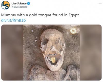 सोन्याची जीभ असलेली ममी इजिप्तमधील प्राचीन भाग तापोसिरिस मॅग्नामध्ये सापडली आहे. ही ममी साधारण २ हजार वर्ष जुनी आहे. इजिप्शिअन एंटीक्वीटिस मिनिस्ट्री द्वारे सांगण्यात आले आहे की, त्यावेळी अशी मान्यता राहिली असेल की मृत्यूमुखी पडणारा देवाशी बोलतो, त्यामुळे त्याला सोन्याच्या जीभेसह दफन केलं असेल.
