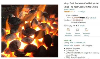 अॅमेझॉनवर १० हजार रुपयांपासून कोळश्याची विक्री सुरू होत असून जो कोळसा लगेच जळतो किंवा कमी धूर निर्माण करतोय असा कोळसा जास्त प्रमाणात विकला जात आहे. या कोळश्याला रेटींगसुद्धा जास्त आहे. लोक जास्तप्रमाणात या कोळश्याची खरेदी करत आहेत.