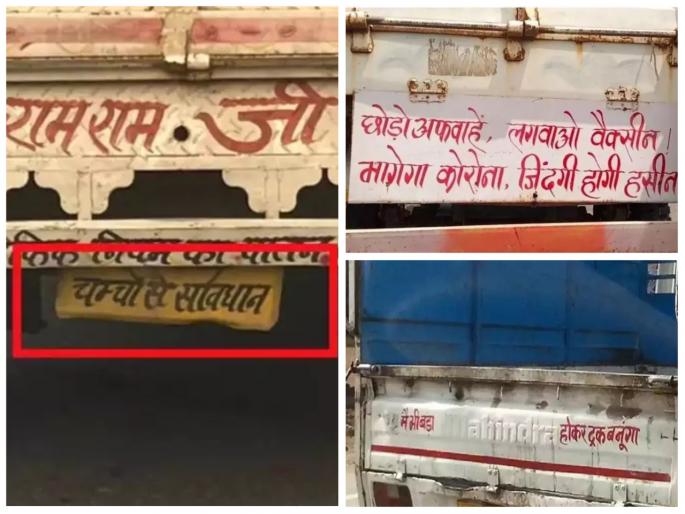 1 / 11रस्त्यावरील प्रवासादरम्यान आपल्या बहुतेक वेळा ट्रक, टेम्पो दिसत असतात. हायवेवर धावणाऱ्या ट्रकची एक वेगळीच स्टाइल असते. मग ते त्यांचे म्युझिकल हॉर्न असोत किंवा त्यांच्या मागे लिहिलेले काही डायलॉग्स किंवा शायरी असो. रोड ट्रिपदरम्यान याची मजा काही औरच असते. पाहुया अशाच काही भन्नाट शायरी. तुम्हालाही नक्कीच तुमच्या जीवनातलं अर्ध ज्ञान इकडेच मिळालं असं वाटेल.2 / 11किचड मैं पैर रखोगी तो.. पाहा काय म्हणतोय हा ट्रकवाला.3 / 11हे इगोवर नक्कीच घेऊ नका, बाकी तुमची मर्जी4 / 11बुरी नजर वाले तू सौ साल जिये….5 / 11घरातून काढून टाकलं गाडी चालवणाऱ्याला…6 / 11ड्रायव्हरचं स्टेअरिंग आणि ब्रेकवालं जीवन...7 / 11हा तर शब्दांचा खेळ आहे…8 / 11पाहा काय म्हणतोय हा ट्रकवाला…असं काहीच नसतं, मुळीच नसतं9 / 11जलते है दुश्मन.. खिलते है फुल…10 / 11जबरस्तच… सोडा अफवा, घ्या व्हॅक्सिन…11 / 11मी तर मोठा होऊन ट्रकच बनणार…