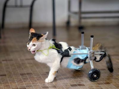 आठ महिन्यांची मांजर नवव्या मजल्यावर पाचव्या मजल्यावर पडल्यानं तिचे मागचे दोन्ही पाय निकामी झाले. त्यामुळे मांजराला चालता येणं शक्य होतं नव्हतं. त्यामुळे तिच्या शरीराच्या मागच्या भागाला, पायांजवळ दोन चाकं लावण्यात आली.