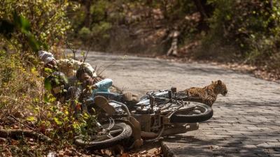 बाइकवरून तीन लोक जात होते. अचानक समोर बिबट्या आल्याने त्यांचा बॅलन्स बिघडला आणि बाइक बिबट्यावरच पडली. यात तिघांनाही फार जास्त इजा झाली नाही. तेच बिबट्या लगेच तेथून पसार झाला.