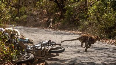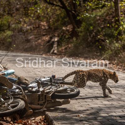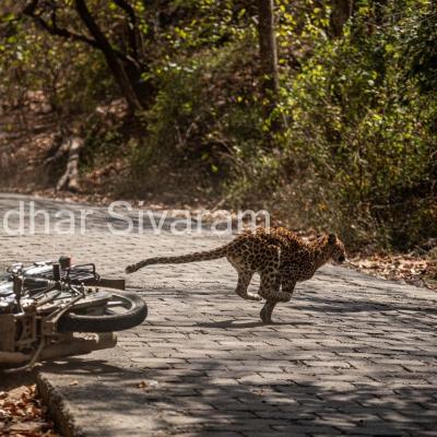 फोटोग्राफर श्रीधर शिवाराम आपला गाइड बॉबीसोबत जंगलात फोटो काढण्यासाठी गेले होते. पण यादरम्यान एका बिबट्याचा टक्कर एका बाइकसोबत झाली.