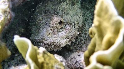 आधी समजलं नाही की, हा मासा आहे की, फॉसीलाइड् कोरल स्केलेटन. चार सेकंदानंतर माशाने शरीराच रंग बदलून काळा केला. तेव्हा लक्षात आलं की, ही दुर्मीळ स्कॉर्पियनफिश आहे. (फोटोः CMFRI)
