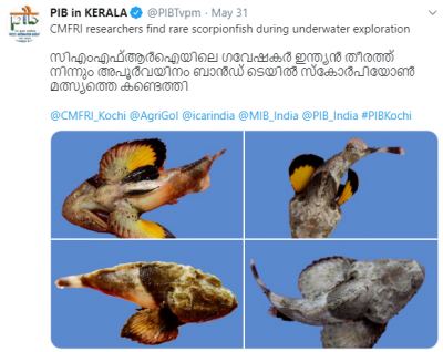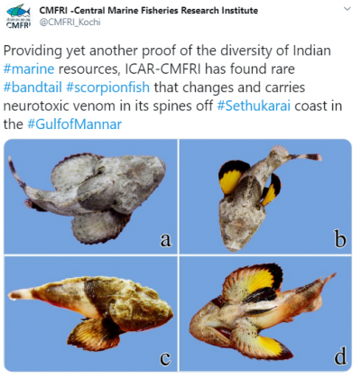 पहिल्यांदाच एखाद्या भारतीय जलस्त्रोतात असा मासा शोधला गेलाय. या माशाला Scorpionfish असं नाव देण्यात आलं आहे. हा मासा शिकार करताना आणि स्वत:चा बचाव करताना रंग बदलू शकतो. सोबतच याच्या पाठीच्या कण्यात विष भरलेलं असतं. जर याला काळजीपूर्वक पकडलं नाही तर तो ते विष सोडू शकतो. (फोटोः CMFRI)