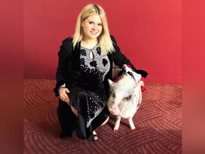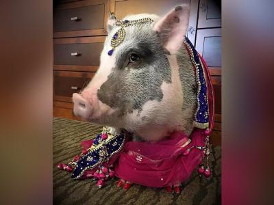 एखाद्या पायलटप्रमाणे टोपी आणि चमकदार नखांनी डुकरांची तयारी केली जाते.
