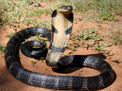 किंग कोब्रा- हा जगातील सर्वात लांब विषारी साप आहे. याची लांबी 18 फूटापर्यंत असू शकते. हा साप आपल्या शरीराचा एक तृतीयांश भाग उंच करू शकतो. या सापाचे शास्त्रीय नाव 'ओफीफॅगस हॅना' आहे. याच्या दंशाने 7 मिलीलीटर विष शरीरात जाते. हा साप चावल्यानंतर काही मिनिटातच मृत्यू होऊ शकतो.