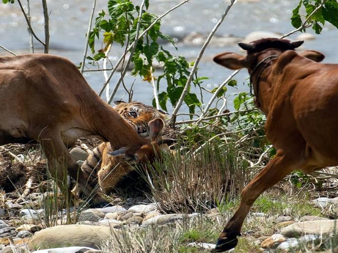 1 / 8एखाद्या भूकेलेल्या वाघिणीची किंवा वाघाची अवस्था कशी असते हे तुम्हाला माहिती असेलच. उत्तराखंडच्या रामनगर परिसरात जीम कॉर्बेट नॅशनल पार्कमध्ये एका वाघिणीनं आपल्या तीन बछड्यांसोबत गाईची शिकार केली आहे. वाइल्डलाइफ फोटोग्राफर मुकेश यादव आणि अभिनव मल्होत्रा यांनी हे फोटो शेअर केले आहेत. 2 / 8व्यवसायाने टूरिज्म गाईड, चाइनीज लॅग्वेज इंटरप्रेटर आणि भटकंती करणारे मुकेश यादव हे फोटोग्राफर आहेत. तर अभिनव हे आयटी सेक्टरमध्ये कार्यरत आहेत. मुकेश नेहमी जिम कॉर्बेट भागातील जंगलात वाघ आणि वाघिणींचे फोटो घ्यायला जातात. ३० ऑगस्टच्या सकाळी या दोन्ही फोटोग्राफरर्सना हा अद्भूत नजारा पाहायला मिळाला आहे. हे दूर्मीळ दृश्य त्यांनी आपल्या कॅमेरात कैद केलं आहे. 3 / 8३० ऑगस्टला वाघिण आपल्या बछड्यांसह रामनगरच्या मागिल बाजूस टेढा गावात आली होती. दरम्यान नदीकाठी वाघिणीला गाय दिसली. आपल्या बछड्यांनी गाईला सर्व बाजूंनी घेरल्यानंतर गाईची शिकार केली आहे. 4 / 8स्थानिक लोक या वाघिणीला कनकटी म्हणतात. कारण या वाघिणीचा एक कान कापलेला आहे. चेहरा आणि नाकावर खूप जखमा आहेत. तरीसुद्धा एका वाघाला टक्कर देऊ शकेल इतकी बलाढ्य ही वाघिण आहे. 5 / 8या वाघिणीचे बछडे १४ महिन्यांचे आहेत. त्यांना रोज जेवण मिळावं म्हणून ही वाघिण शिकाराच्या शोधात असते. 6 / 8मुकेश आणि अभिनव या वाघिणीच्या मागावर गेल्या एका महिन्यापासून होते. मुकेश यांनी दिलेल्या माहितीनुसार कोणच्याही जंगलात अशी दूर्मीळ दृश्य दिसण कठीण असतं.7 / 8गाईची शिकार केल्यानंतर वाघिणीनं आपलं पोट भरलं आणि जंगलात निघून गेली. 8 / 8वाघिणी शिकाराचे मास खाण्यासाठी पुन्हा त्यात ठिकाणी येते. स्थानिक लोक या शिकाराला हात लावत नाहीत. त्यामुळे या ठिकाणी वाघांची संख्या जास्त आहे. (Image credit- Abhinav Malhotra, Mukesh Yadav, aajtak)
