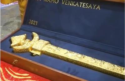 श्रीनिवासन दाम्पत्याने सोमवारी सकाळी तिरूमाला तिरूपती मंदिराच्या अधिकाऱ्यांकडे ही तलवार सोपवली. श्रीनिवास दाम्पत्याने रविवारी तिरूमालाच्या कलेक्टिव गेस्ट हाउसमध्ये मीडियासमोर साडे सहा किलोग्रॅमची सोन्याची तलवार दाखवली. असं सांगितलं जात आहे की, श्रीनिवास यांना गेल्यावर्षापासून ही तलवार इथे दान करायची होती. पण कोरोनामुळे ते जमू शकलं नव्हतं.