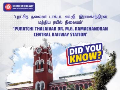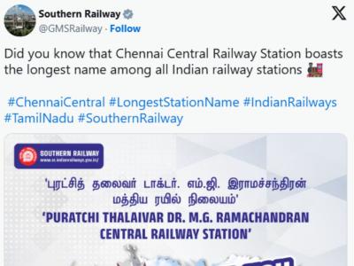 Southern Railway ने आपल्या अधिकृत X अकाऊंटवर तामिळनाडूच्या पुराच्ची थलायवर डॉ. एम.जी. रामचंद्रन सेंट्रल रेल्वे स्टेशनची माहिती शेअर केली आहे. या पोस्टमध्ये सांगण्यात आलं आहे की, चेन्नई सेंट्रल रेल्वे स्टेशनचं नाव भारतात सगळ्यात मोठं आहे. ज्यात ५७ अक्षरं आहेत.