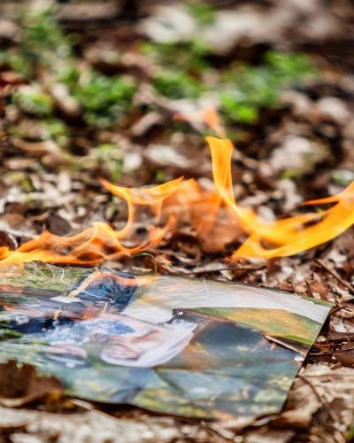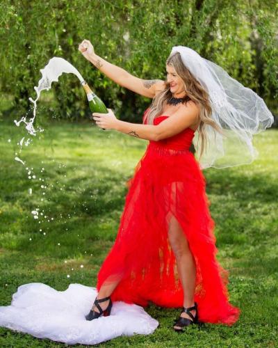 लाल गाऊन परिधान केलेल्या घटस्फोटाचा उत्सव साजरा करणाऱ्या महिलेच्या पहिल्या फोटोत ती घटस्फोट लिहिलेली दोरी हातात धरून हसत आहे. दुसऱ्या फोटोत ती तिचा लग्नाचा गाऊन जाळत आहे.