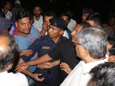 रखडलेल्या शिवाजी पुलाचे काम तातडीने पूर्ण करावे, अशी मागणी ‘सीपीआर’च्या आवारात संतप्त नागरिकांनी सार्वजनिक बांधकाममंत्री चंद्रकांतदादा पाटील यांच्याकडे केली व त्यांना रोखून धरले. (दीपक जाधव)